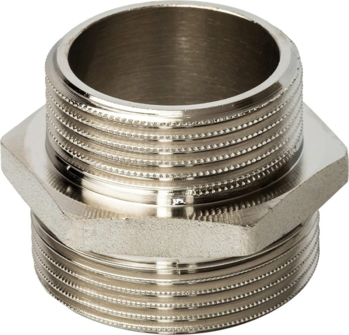 Латунный никелированный фитинг (ниппель), представляющий собой изделия с наружной резьбой на обоих концах, с помощью которых они соединяются с другими участками трубопровода разного диаметра, резьба цилиндрическая трубная по ГОСТу 6357-81. Предусмотрен участок корпуса шестигранной формы, под гаечный ключ, что облегчает монтаж соединения. Фитинги рассчитаны на рабочее давление (PN) 2,5 и 4,0 МПа и температуру транспортируемых сред от -20 до +150 °С.