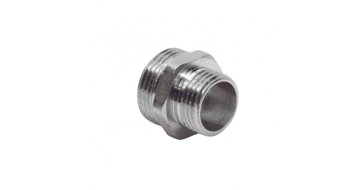Латунный никелированный фитинг (ниппель), представляющий собой изделия с наружной резьбой на обоих концах, с помощью которых они соединяются с другими участками трубопровода разного диаметра, резьба цилиндрическая трубная по ГОСТу 6357-81. Предусмотрен участок корпуса шестигранной формы, под гаечный ключ, что облегчает монтаж соединения. Фитинги рассчитаны на рабочее давление (PN) 2,5 и 4,0 МПа и температуру транспортируемых сред от -20 до +150 °С.